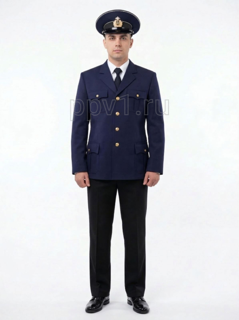 Состав материала: шерсть 45%, полиэстер 55%. Застежка: пуговицы, молния. Повседневная форма одежды мужского комплекта работников Федерального агентства морского и речного транспорта.